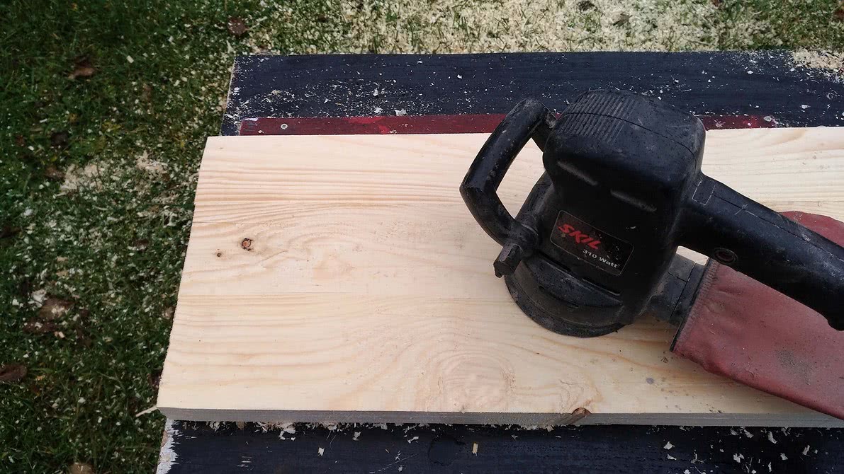 Спустя сутки-двое можно приступать к обработке поверхностей. Сначала ступень остругивают, стремясь сделать идеальную плоскость (для контроля используют ровную рейку, линейку или угольник). Далее следует черновая шлифовка шкуркой P80 (можно применять как ленточную, так и эксцентриковую шлифмашину). После этого нужно заделать трещины, высмолы и другие дефекты шпаклёвкой, которую покупают готовой и смешивают самостоятельно из любого атмосферостойкого лака и древесной пыли (если планируется красить ступени в тёмный цвет, нужно сразу заколеровать шпаклёвку). Финишную шлифовку проводят шкуркой P120, для идеального результата — ещё и P240.