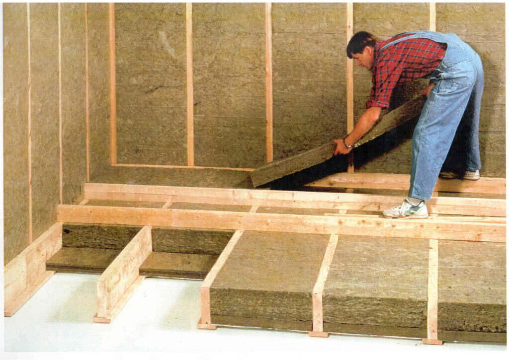 Наиболее эффективной шумоизоляции можно добиться, если поэтапно сочетать волокнистые материалы с настилами и утеплять обе части межэтажного деревянного перекрытия.
