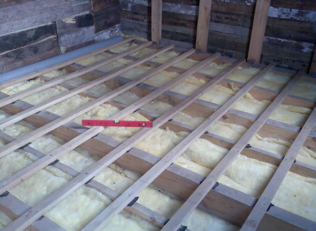 Работы по изоляции перекрытия от «ударного» звука нужно начинать с деревянных балок.