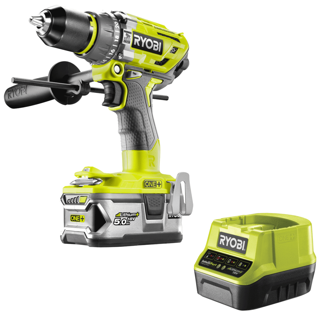 - RYOBI R18PD7-0 — современное устройство с усовершенствованным двигателем, встроенным компьютером, управляемой электроникой муфтой. В оборудовании присутствует клавиша блокировки включения, производительность равна 85 Нм. В комплекте отсутствует батарея и зарядное, они покупаются отдельно. Дополнительные приспособления к аппарату представлены ограничителем глубины сверления и второй рукоятью.