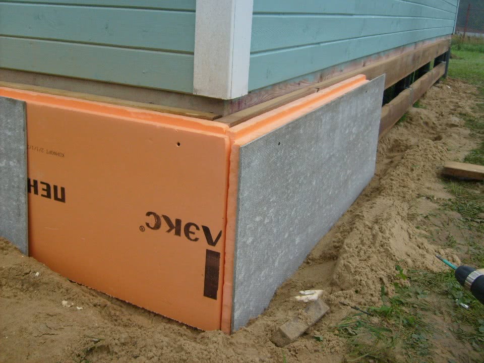 4. После того, как сам дом возведен, можно начинать работы по внешнему утеплению (укреплению) фундамента. Для этого весь периметр фундамента нужно обнести изоляционным материалом. Лучше использовать пенопласт. Пропитайте его специальной грунтовкой для придания прочности и повышения гидроизоляции. Если вы используете минеральную вату, нужно дополнительно закрепить ее сплошной деревянной конструкцией.