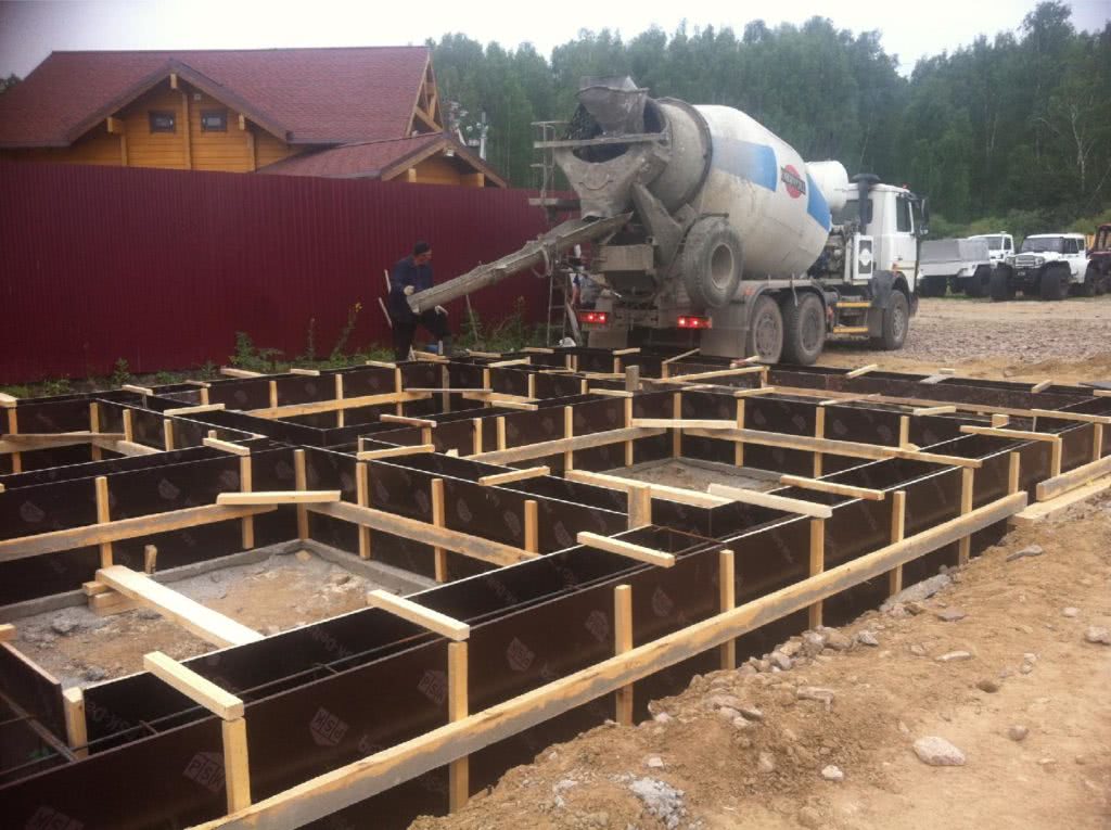 - Последним шагом становится заливка фундамента бетоном. При этом используется только тяжелый бетон, включающий в себя щебень или кварцевый песок. Весь процесс заливки проводится непрерывно, при этом послойно, каждый из слоев уплотняется.