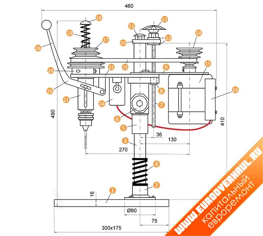 С пружинно-шарнирным механизмом: 1 — станина; 2 — шайба; 3 — гайка М16; 4 — амортизационные стойки 4 шт.; 5 — пластина; 6 — болт М6х16; 7 — блок питания; 8 — тяги; 9 — пружина; 10 — болт М8х20 с гайкой и шайбами; 11 — патрон для сверла; 12 — вал; 13 — крышка; 14 — ручка; 15 — болт М8х20; 16 — державка; 17 — стойка; 18 — стакан с подшипником; 19 — двигатель.