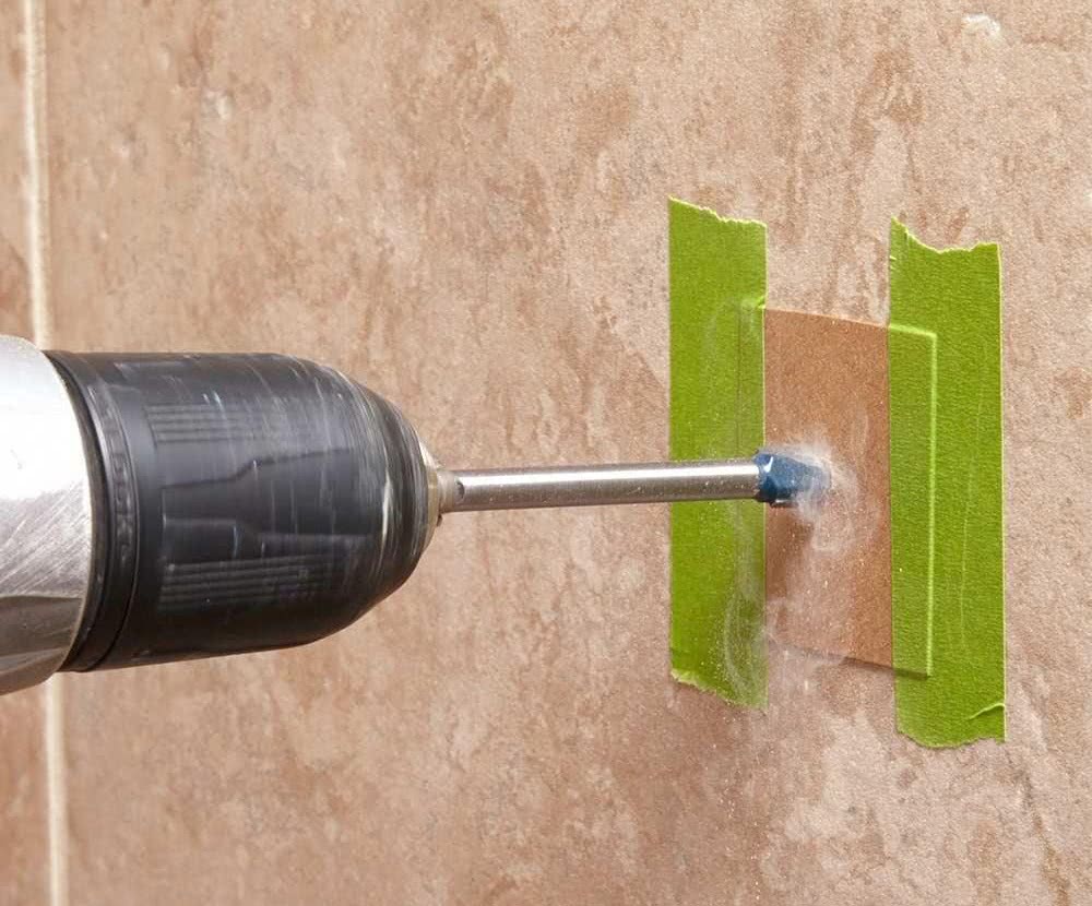 Вначале намечают место, где будет находиться отверстие. Потом на плитку наклеивают скотч. Если он непрозрачный, то на нем следует поставить крестик в том месте, где будет находиться отверстие.