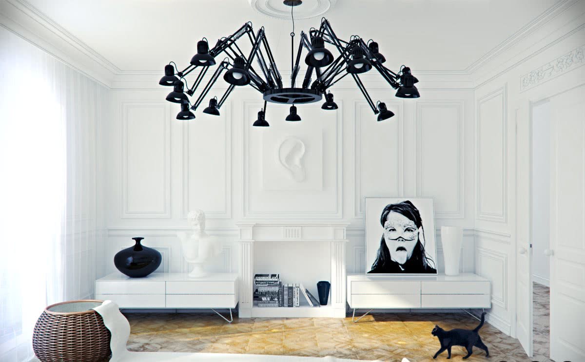 Необычная конструкция люстры паук оптимально впишется в дизайн интерьера лофт. Промышленный антураж предпочитают люди творческих профессий, с нестандартным мышлением и любовью к экспериментам. Своеобразная модель гармонично дополнить минимализм и напускную небрежность интерьера.