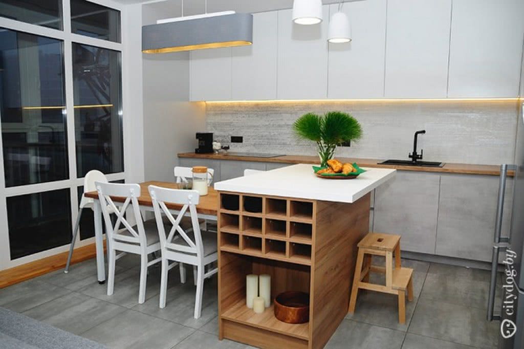 Идеальная универсальная столешница для серого гарнитура – под дерево, светлых оттенков или белоснежная.