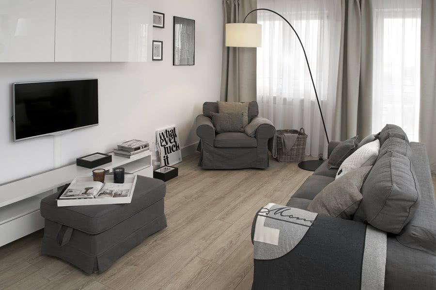 Серый цвет не обязательно должен быть скучным, а гостиная в этом оттенке — прохладной и неприятной. Чтобы в этом помещении не было мрачного климата, самое главное — помнить о правильном освещении. Серый цвет поглощает свет и легко сделать комнату темной и неприятной. Также стоит подумать о мебели и аксессуарах, которые добавят климат в гостиную и в то же время сделают ее ярче.