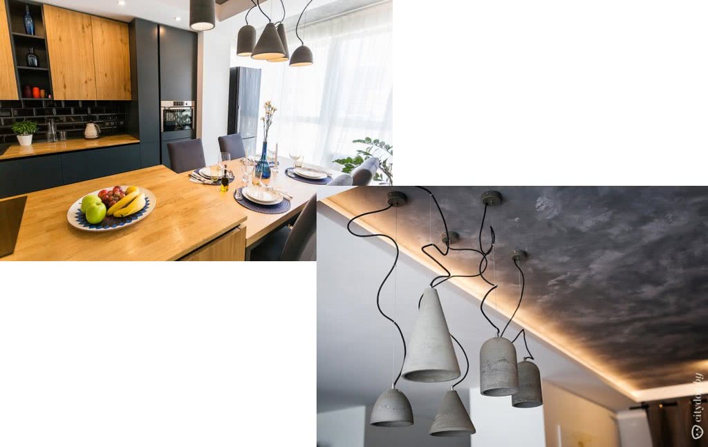 Для него не стоит выбирать кричащие яркие оттенки, ведь обратить на себя внимание может даже серая фактурная вставка под бетон в подвесной конструкции, дополненная красивым светильником