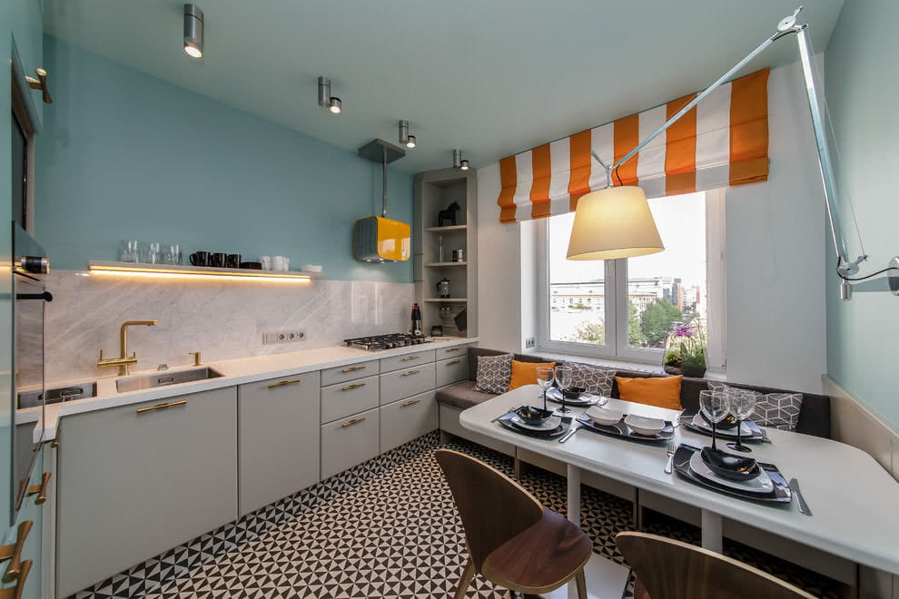Настроение интерьеру традиционно задают шторы. С серой кухней могут отлично смотреться яркие короткие занавески, рулонные или римские шторы насыщенных желтых, красных, синих, зеленых тонов.