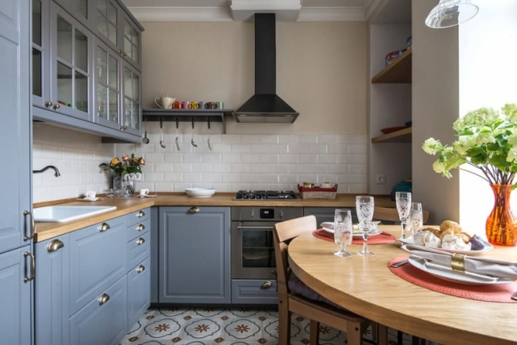Серые фасады позволяют быть смелее в выборе дизайна фартука. Яркая плитка или скинали помогут сделать яркий акцент.