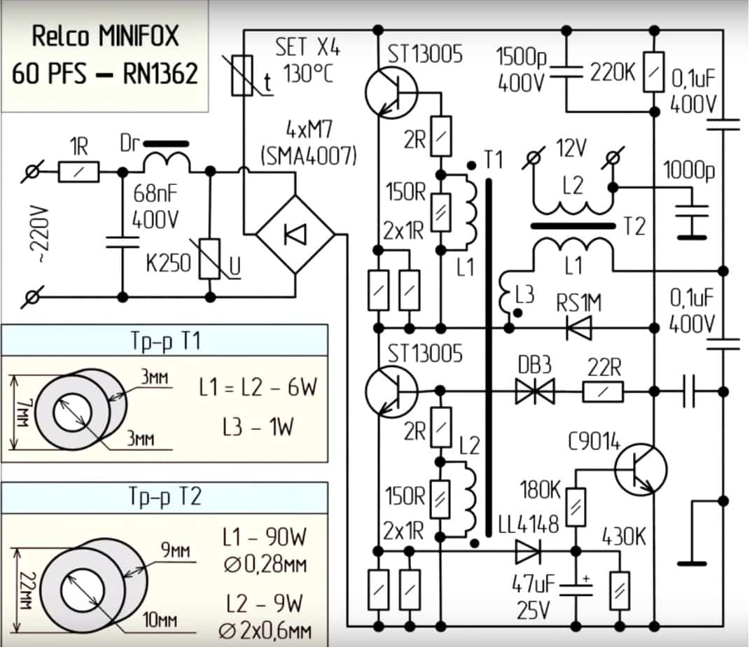 Такой паяльник не подойдет новичку, так как для его создания требуются базовые знания в электротехнике и навыки чтения электрических схем. За основу для изготовления этого агрегата берется импульсный блок питания от галогенных светильников. Хорошо будет получить и схему этого устройства, в рассматриваемом примере она имеет такой вид, хотя может быть и любая другая, в зависимости от модели блока для паяльника:
