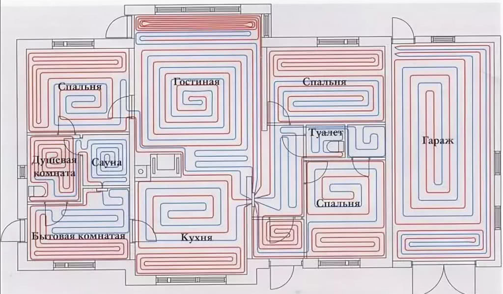 Для этого следует спроектировать укладку контуров теплого пола зонировано. Т.е. труба контура водяного пола должна быть проложена только в одной комнате. Если площадь комнаты больше, чем 12 кв. м. следует уложить два или три контура трубы.