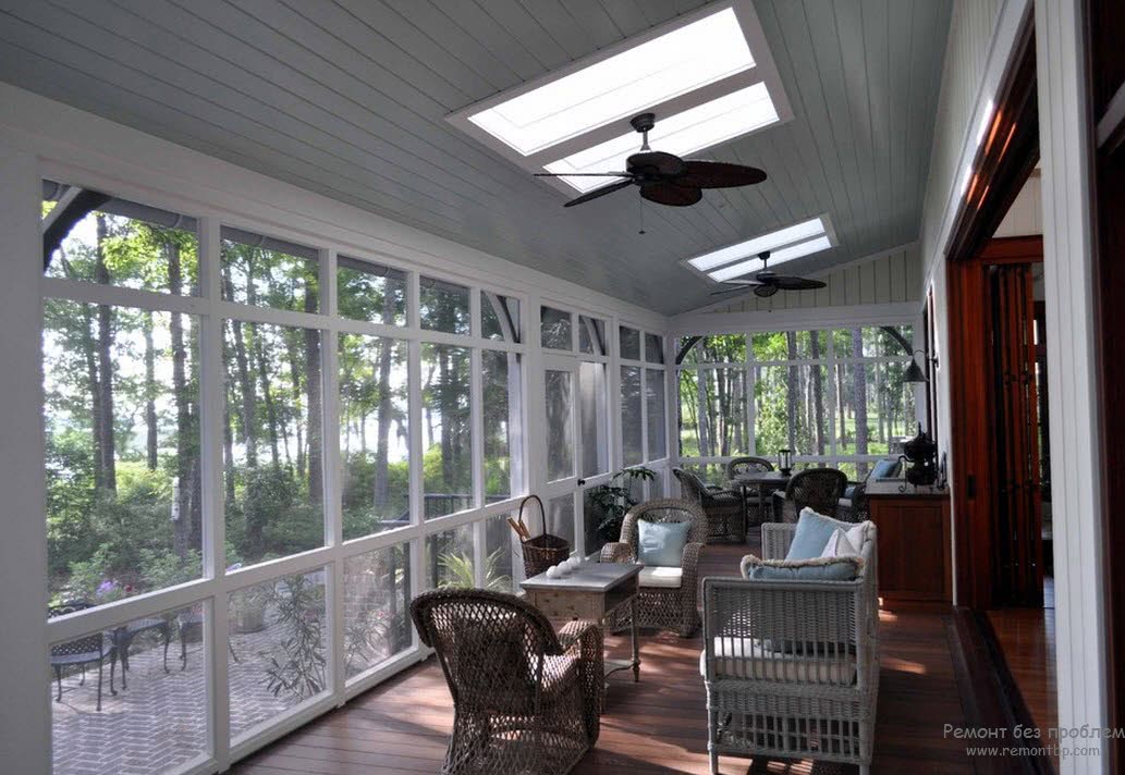Прежде всего, следует учитывать тот факт, что на веранде должно быть много воздуха и света. Однако, слишком много солнца днем тоже ни есть хорошо. В таком случае не мешает позаботиться о жалюзях или шторах. А можно использовать светоотражающую пленку для окон. Открытую веранду очень часто затеняют с помощью вертикального озеленения.