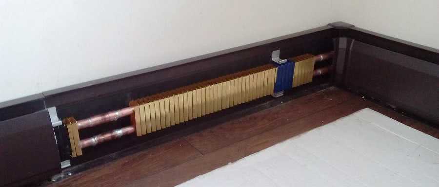 В любом случае, теплый плинтус внешне выглядит так: это две медных трубки, которые одна от другой находятся на расстоянии 7-15 см. Для увеличения теплоотдачи на трубки надеты вертикальные пластины из алюминия, латуни (стоят чуть меньше, но и теплоотдача чуть ниже) или меди (более дорогой и более «теплый» вариант). Сверху трубы с оребрением закрываются декоративными крышками из экструдированного алюминия. Алюминий выбран не случайно — он хорошо передает тепло. Так что нагревшаяся крышка сама излучает тепло.