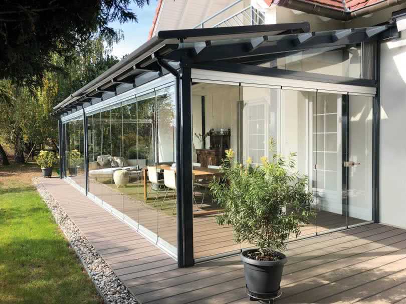 Пристройка веранды может быть функциональной. Для этого проводится установка раздвижных элементов.