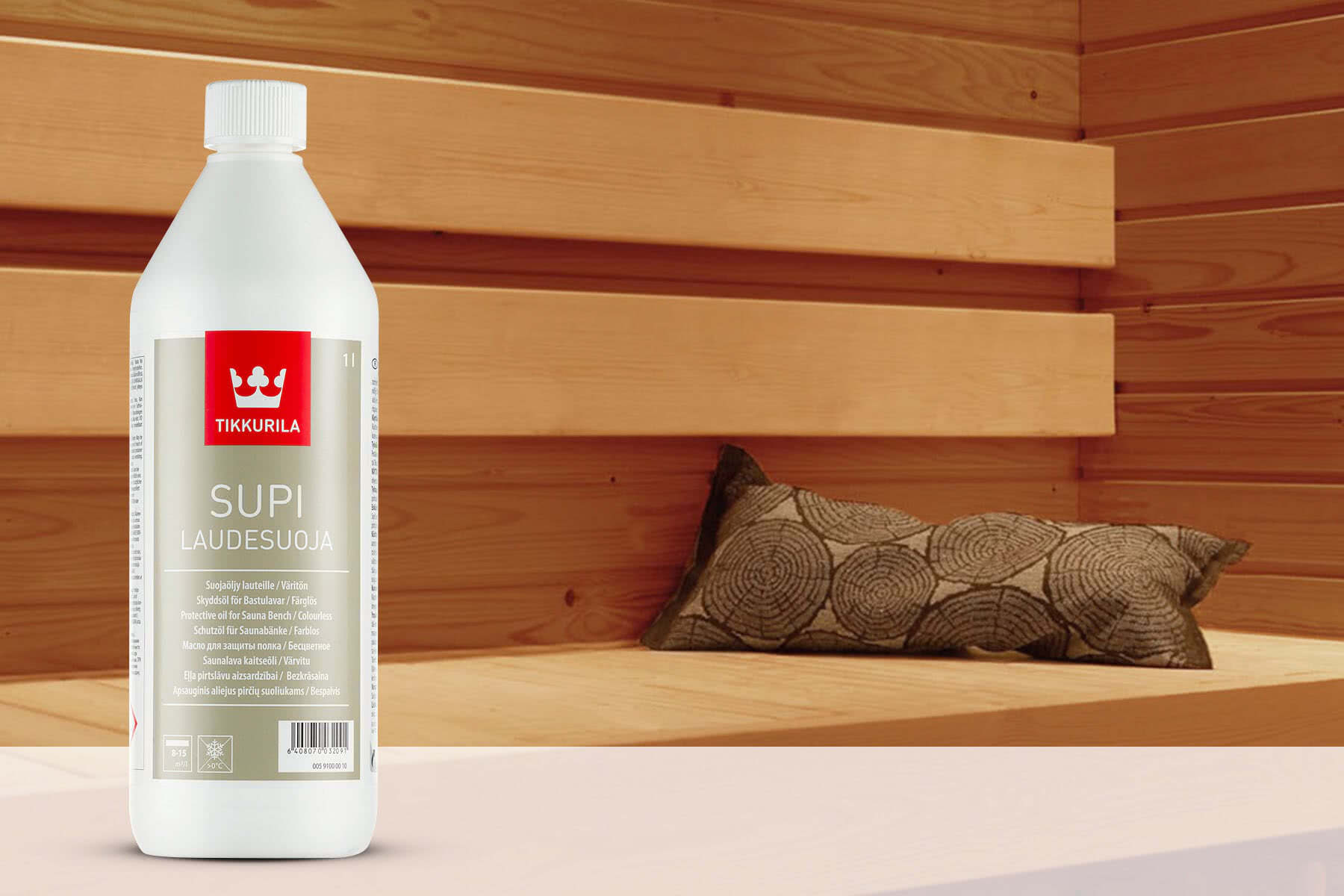 Supi Laudesuoja предназначается для покраски полок сауны, не выделяет вредных веществ, безвредно даже при высоких температурах, применяется в прозрачном виде;