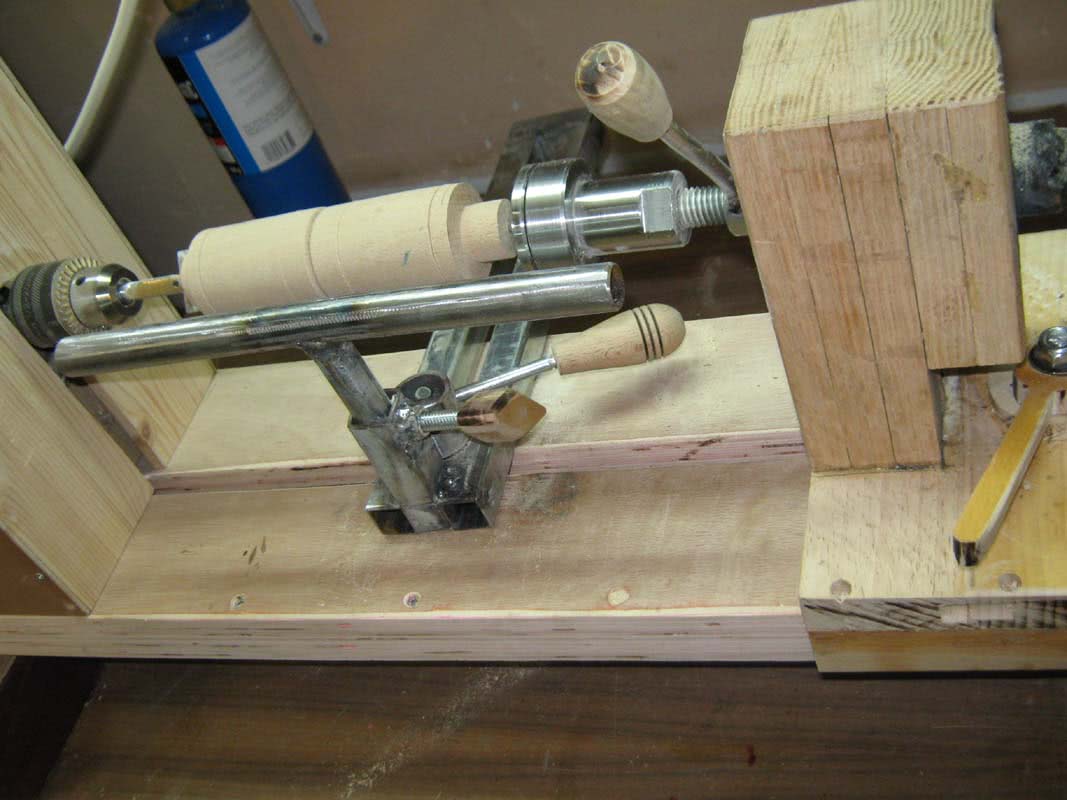 Напротив монтируется задняя бабка с помощью пары уголков и гвоздя или заточенного винта, до более совершенной, в которой дрель служит источником вращающей силы, но не участвует непосредственно в процессе вращения заготовки. Второй способ бережет мотор от перегрева и срыва при перегрузках.