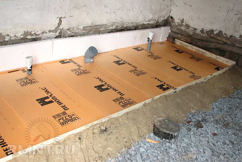 Выравнивать основание можно и песком, но так ли у вас много неровностей Собственно, вся технология. Все ясно. Могут возникнуть только вопросы по минимальной толщине стяжки на Пеноплекс. Производитель рекомендует не меньше 40 мм. При укладке пола во влажных помещениях, плиту желательно покрыть гидроизоляцией. Тип гидроизоляционного материала выбирайте сами. В остальном технология та же.
