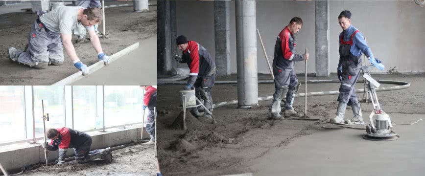 Бетон укладывается по принципу обычной стяжки, после чего его необходимо оставить немного подсохнуть, чтобы по поверхности можно было без проблем передвигаться. На этом этапе, поверхность должна уже быть идеально ровной и обладать абсолютно горизонтальным положением без перекосов и прочих дефектов. После бетонной основы, на поверхность наливается жидкий топпинг, который впоследствии шлифуется и обрабатывается до идеального состояния.
