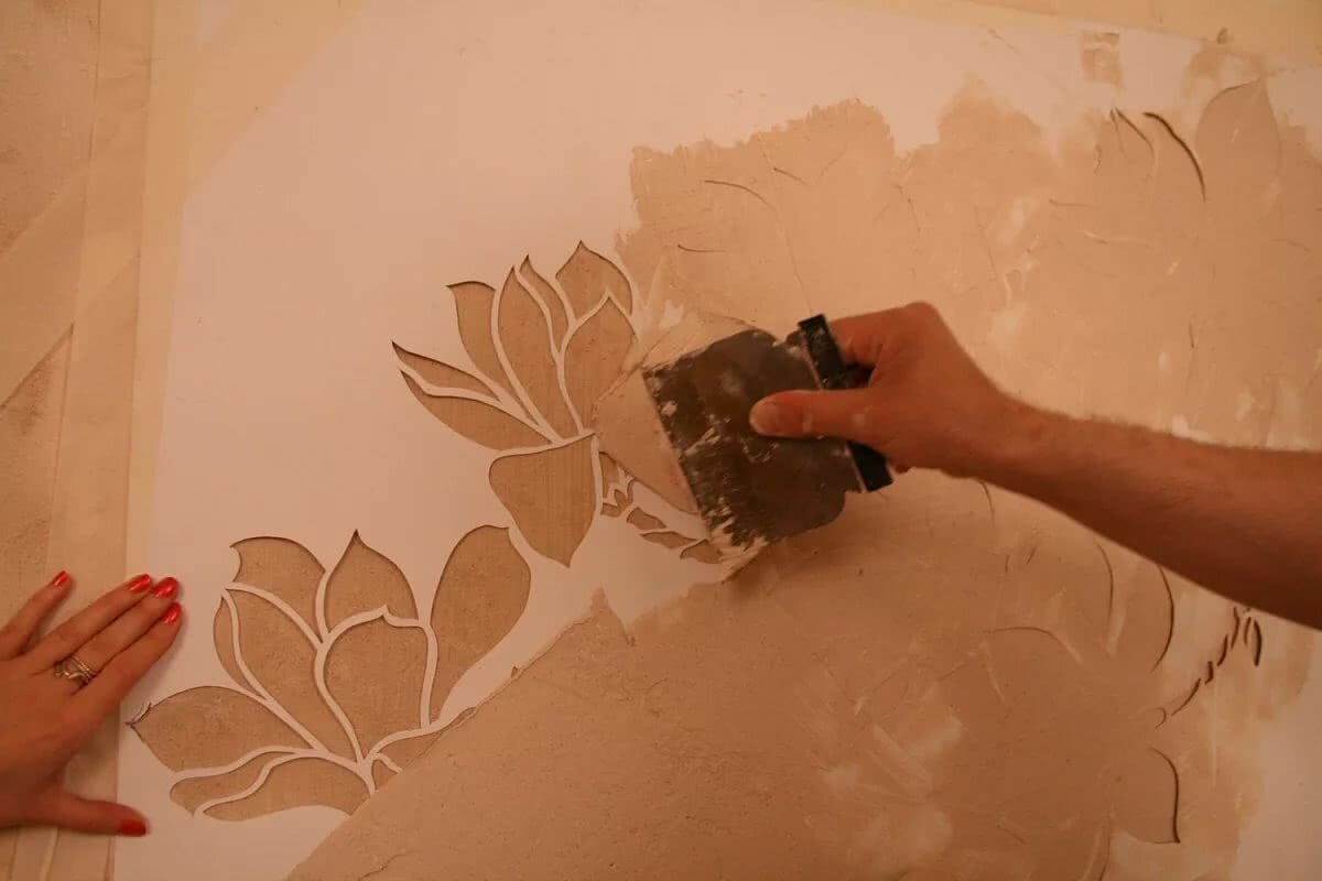 - Трафарет нужно сразу убирать после того, как будет нанесена краска. Если он будет использоваться еще раз, то потребуется предварительная очистка, чтобы на стене не оставалось следов, пока клише будет выравниваться и фиксироваться. А вот для удаления шпаклевки лучше подождать – высохшая смесь легче снимается.