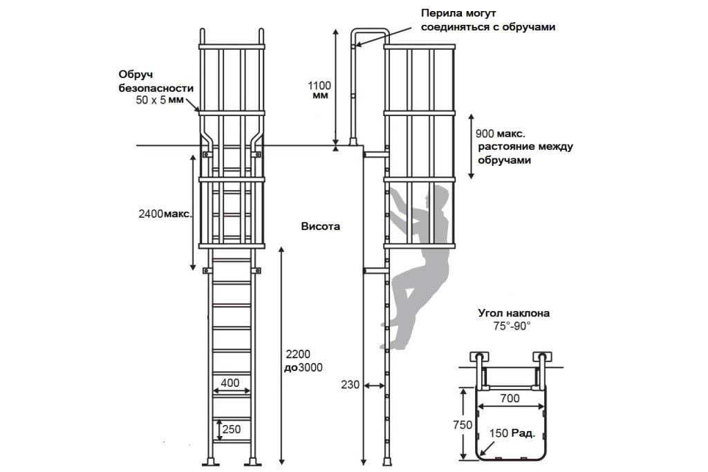 Здесь всего две позиции: маршевая и вертикальная. Последние часто называют противопожарными лестницами на кровлю. Они собой соединяют землю и крышу здания. Но есть здесь особые требования, которые касаются размеров конструкции и возможности их установки. К примеру, на сооружения выше 20 м и ниже 6 м вертикальные модели не устанавливаются. Вертикальные пожарные лестницы, установленные на зданиях высотою 6-20 м, имеют одну особенность – начиная с отметки в 6 м, на нее монтируют овальное ограждение.
