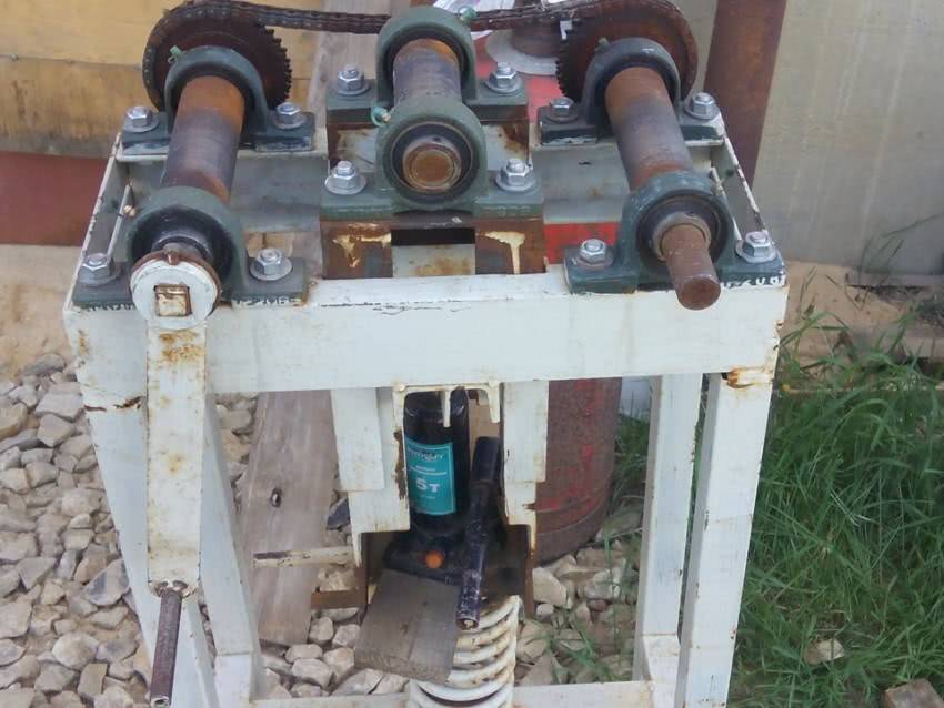 - Заключительный штрих — изготовление рукоятки (можно использовать педаль от велосипеда), посредством которой в действие приводится средний ролик. При вращении рукоятки приводится в движение закрепленная оснастка или швеллер