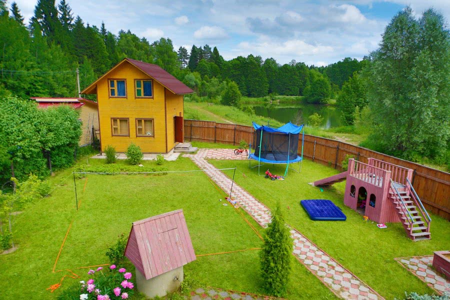 - Дом рядом с северной стороной забора. Дверь дома выходит на просторное крытое крыльцо площадью 9 кв. м. Неподалеку расположен декоративный колодец. В углу баня и хозяйственные постройки.