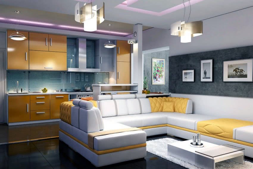 площади помещение. Установленный в центре комнаты угловой диван четко выделит
