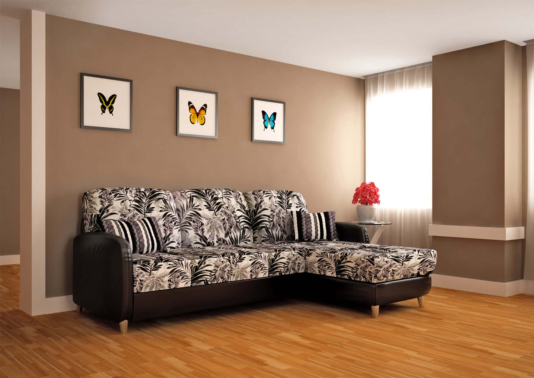 Если комната оформлена в пастельных тонах, подойдет диван коричневого оттенка.