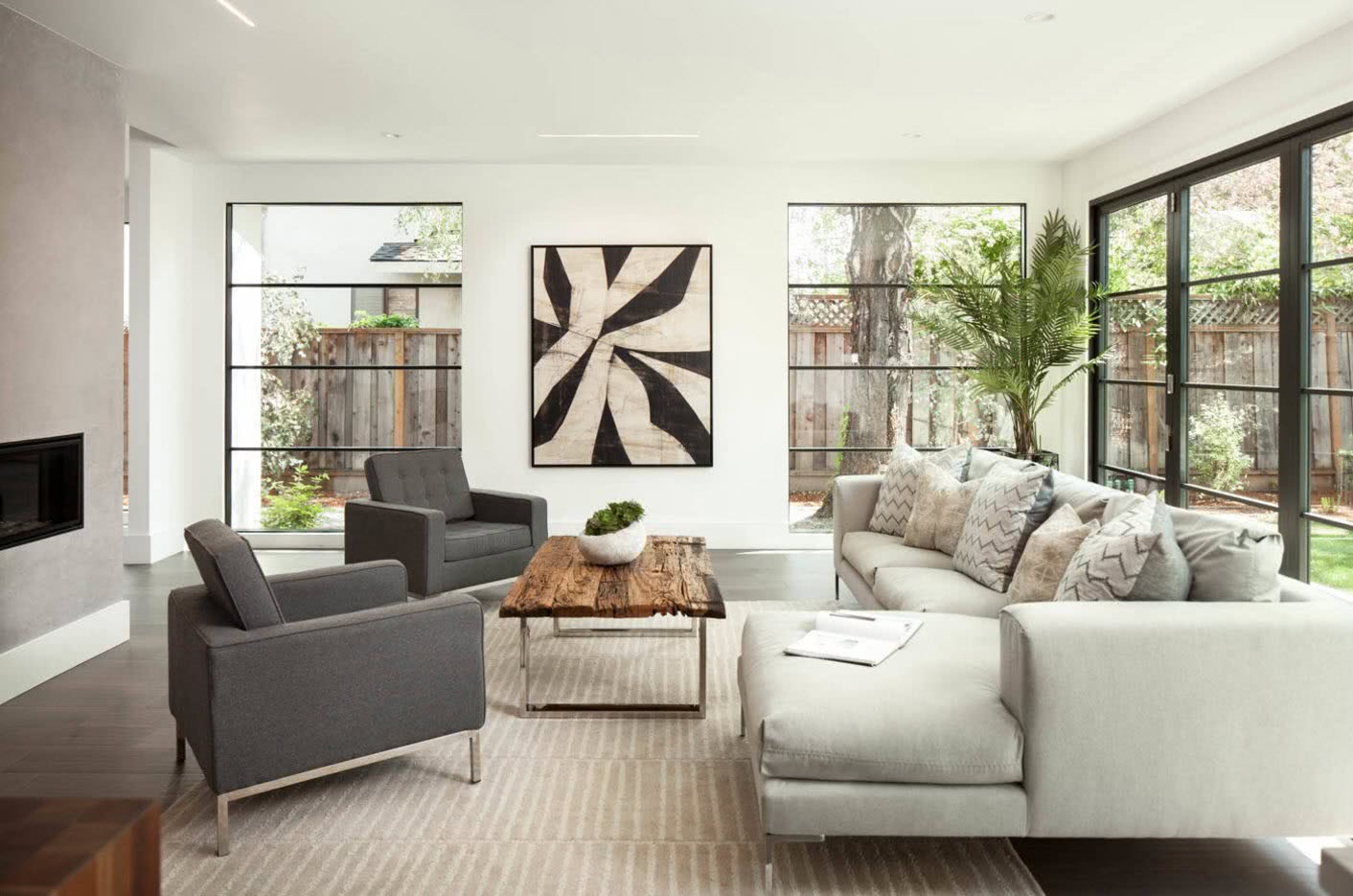 Лидирующие цвета в этом стиле – белый и серый с вкраплением оттенков натуральной древесины. Пространство не загромождено мебелью. Материал обивки представлен в светлой палитре и лишен сложных рисунков.