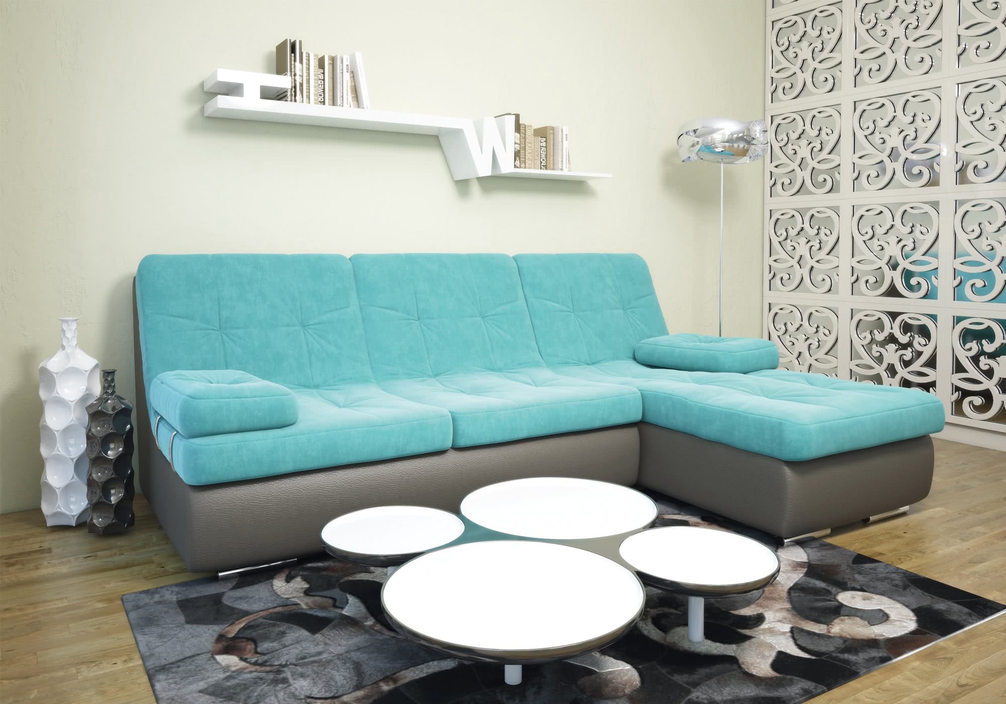 - Модульная конструкция позволит экспериментировать с размещением дивана в любой точке комнаты. Мобильные модули можно двигать и в буквальном смысле «выстраивать» мебель нужной конфигурации. Благодаря этому интерьер всегда можно «освежить», просто переставив элементы конструкции по-новому.