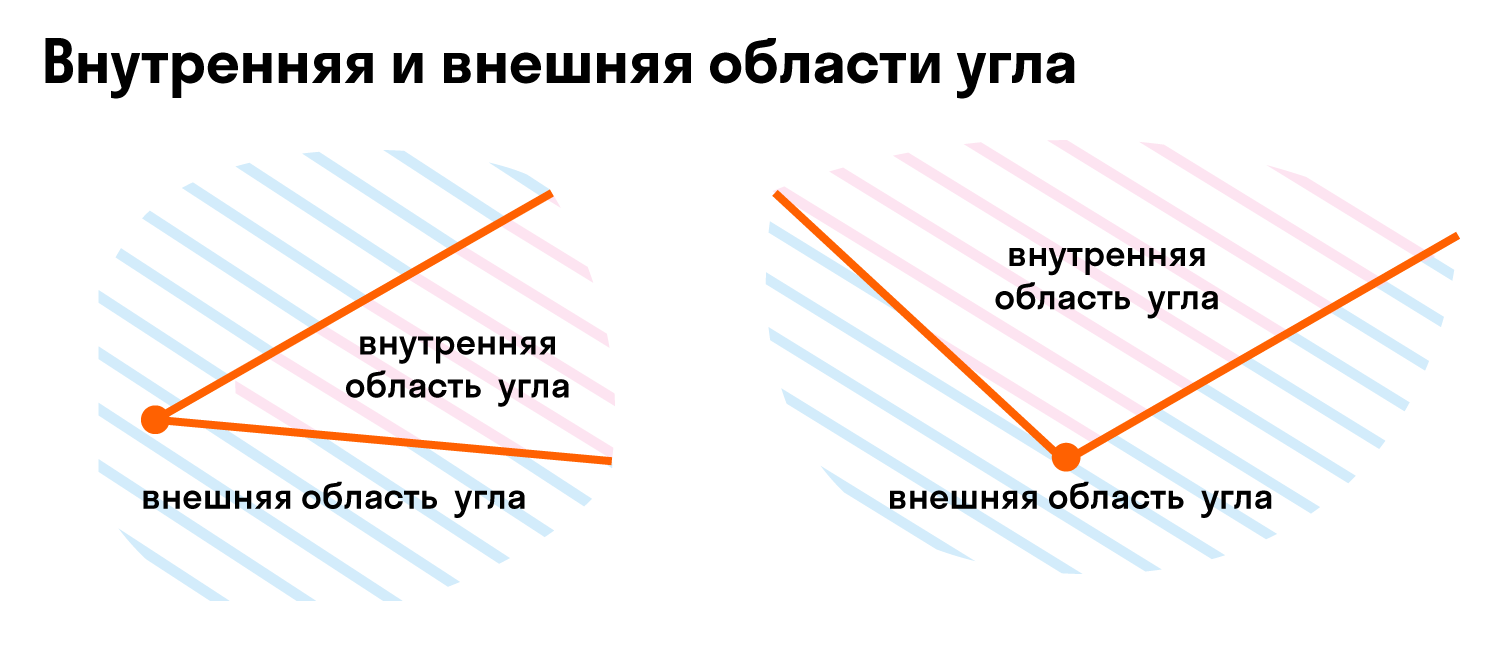 Так как угол делит плоскость на две части, одна будет внутренней областью угла, а другая — внешней областью угла. Вот так:
