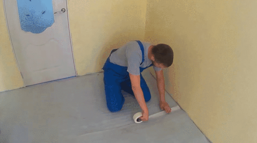 После укладки соседних кусков прокладочного материала, их скрепляют малярным или специальным строительным скотчем по стыкам. Таким образом получается цельное полотно, устойчивое к временным воздействиям при монтаже ламелей напольного покрытия.