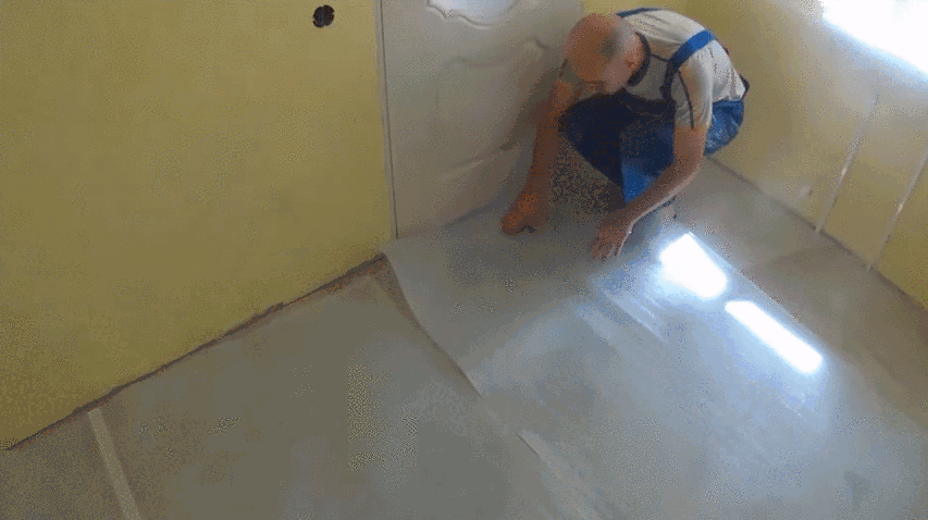 Ее укладывают так, чтобы края заходили на стены, а между полосами образовался нахлест. Скрепляют полосы скотчем. Использование пленки увеличит общую толщину подложки на 0,2 мм.