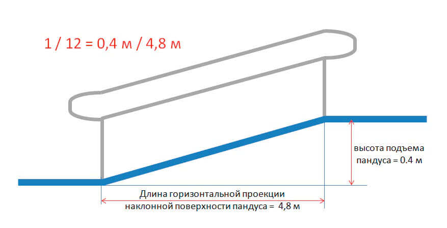 1:12 = 8% — т.е. при перепаде высоты в 1 м, длина пандуса должна быть 12 м, при высоте 0,5 м — длина пандуса должна быть не менее 6 метров и т.д. Угол уклона пандуса будет равен 4,8 градусам.