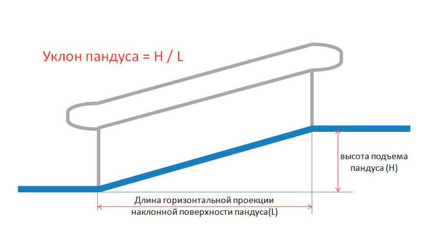Вычисляется уклон пандуса с помощью формулы: наклон пандуса = H / L, где: H — перепад высот, который необходимо оборудовать пандусом, а L — длина горизонтальной проекции наклонного участка пандуса (нажмите для увеличения).