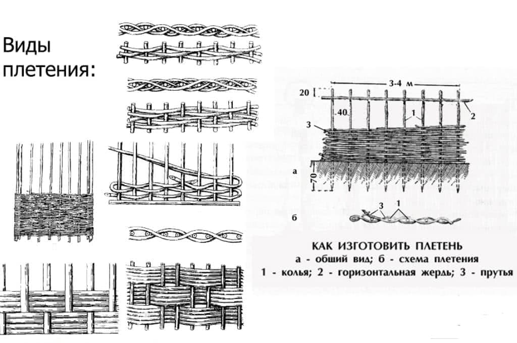 - Между опорами вплетаем подготовленные прутья.Эта работа начинается с самого толстого конца. Процесс плетения проводится восьмёркой, при этом первый столб нужно обойти с лицевой стороны, второй с задней стороны, третий опять с лицевой и так чередовать до окончания работы.