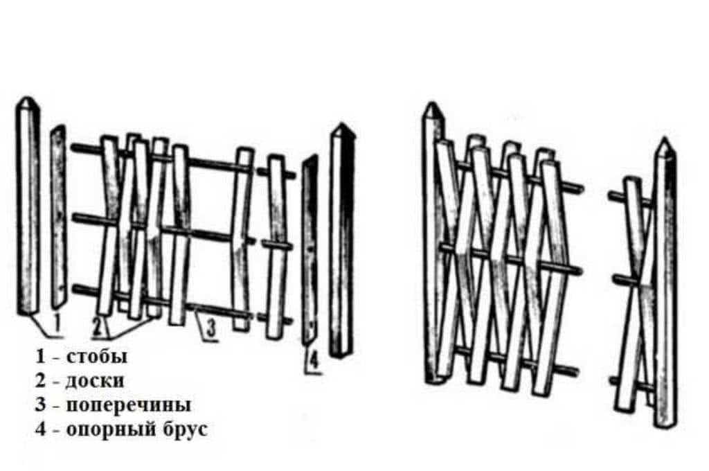 сетчатый забор тоже используется больше в качестве украшения двора или палисадника. Для его строительства понадобятся тонкие деревянные рейки и брусья для опоры. Частоту крепления реек рассчитывают в зависимости от назначения ограждения.