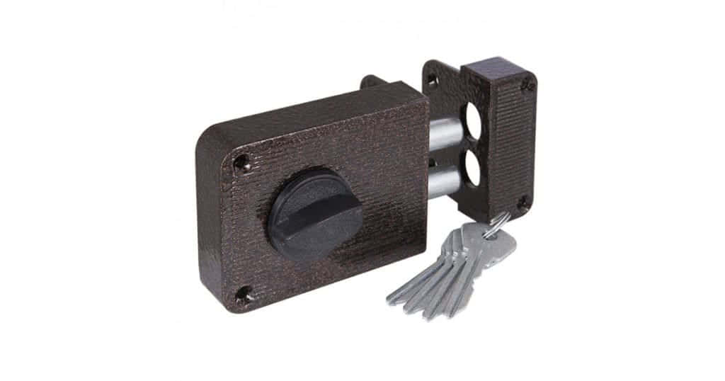 Это очень простая вариация дверного замка. Скважина для щеколды не нужна, поэтому снаружи нельзя распознать наличие такого замка. Конструкция состоит из небольшой металлической пластины с двигающимся рычагом.
