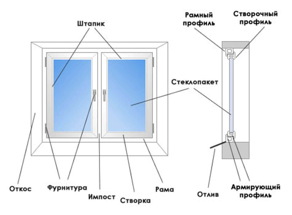 Материал изготовления – поливинилхлорид. Жесткость конструкции придает специальная вставка, расположенная в центре. Большие рамы обычно состоят из двух половин, разделены вертикальной пластиковой перемычкой. Стекла удерживается за счет штапиков в виде тонкой панельки.