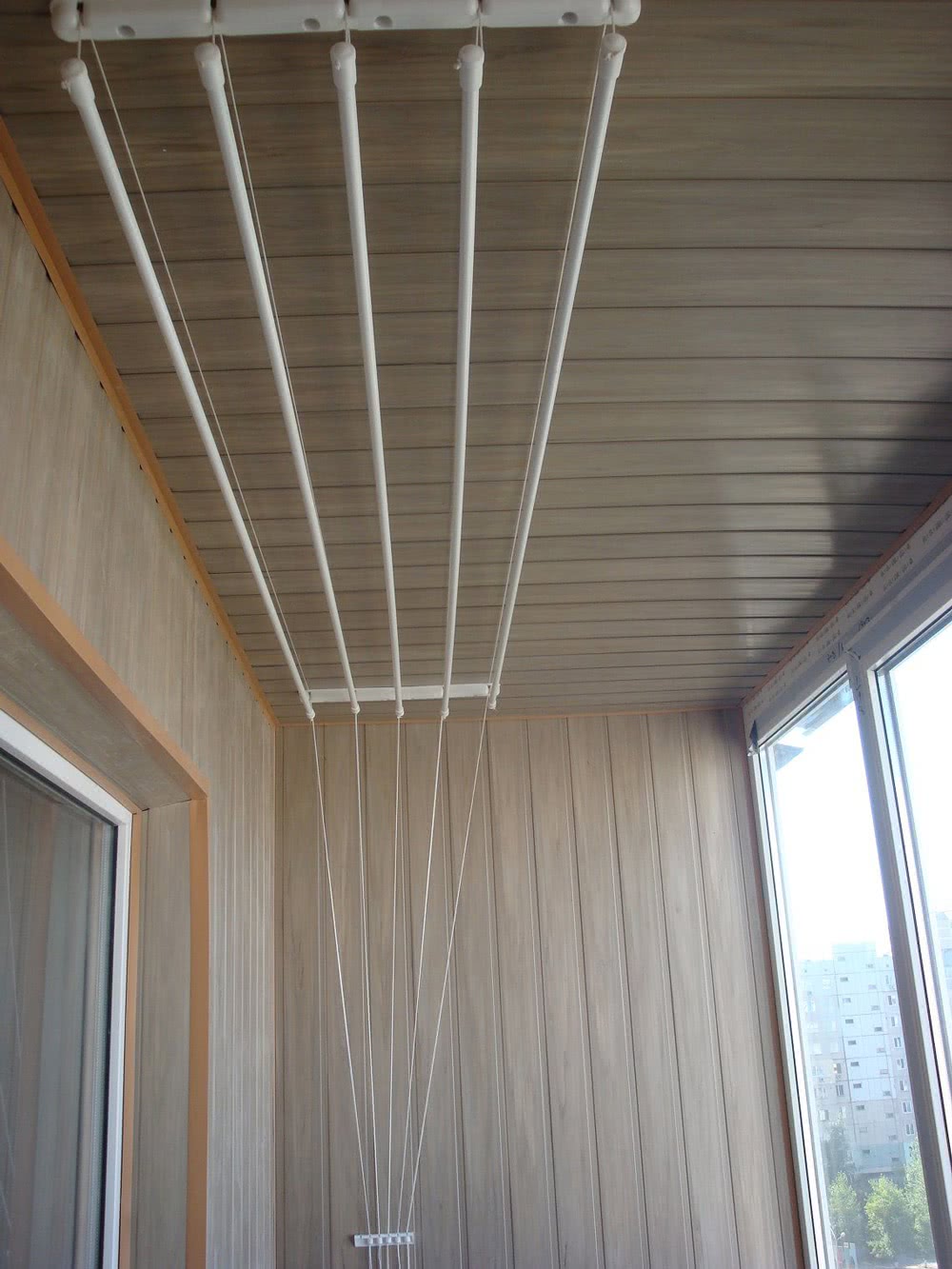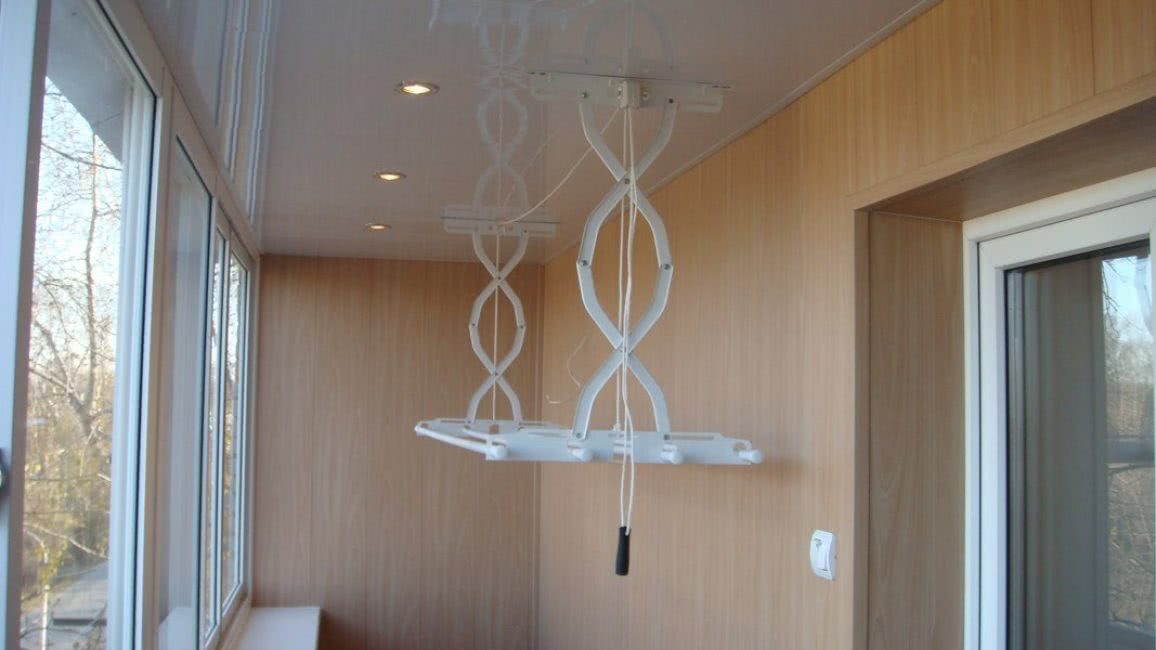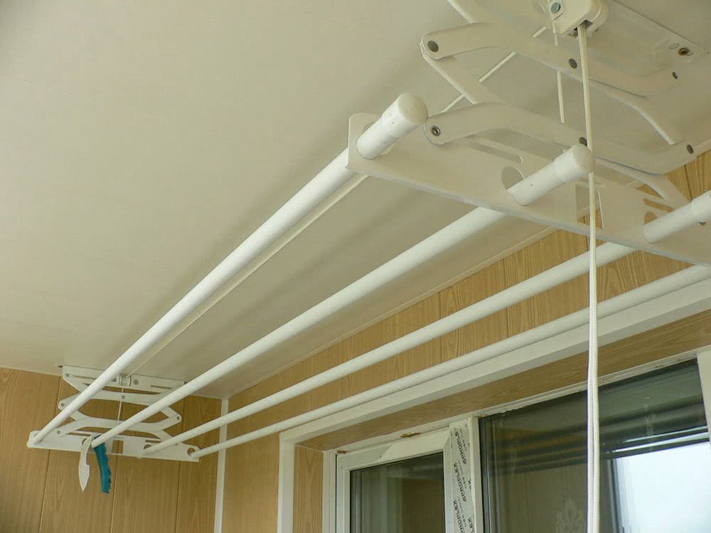 Важно, чтобы при открытии балконных окон сушилка не мешала. На балкон чаще выбирают потолочные варианты