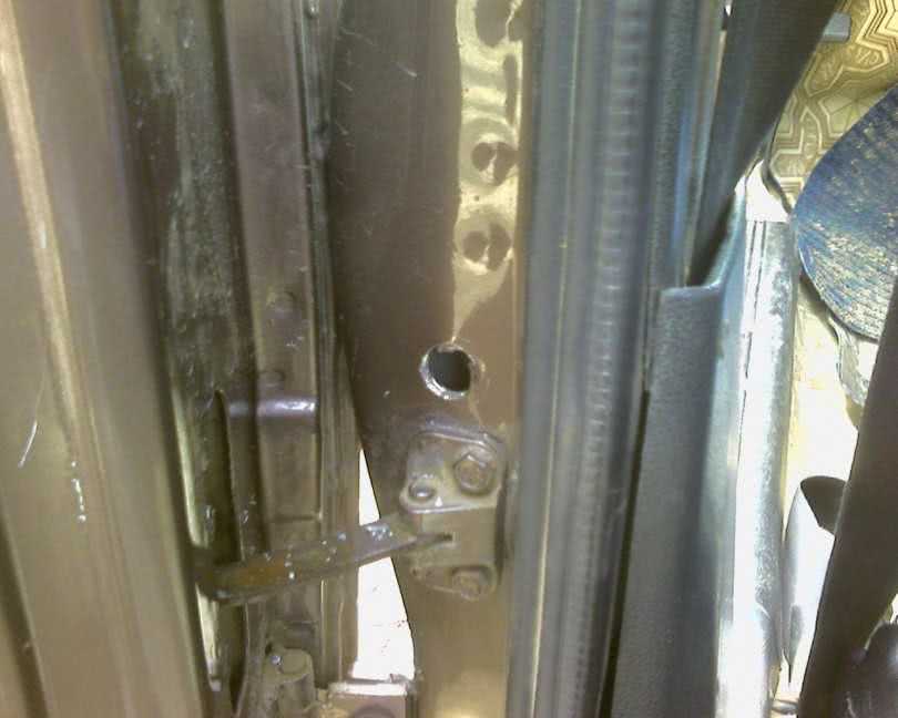 Затем нужно произвести демонтаж декоративных накладок, установленных с внешней и внутренней сторон двери. В нашем случае они крепятся на заклепках, которые мы высверливаем.