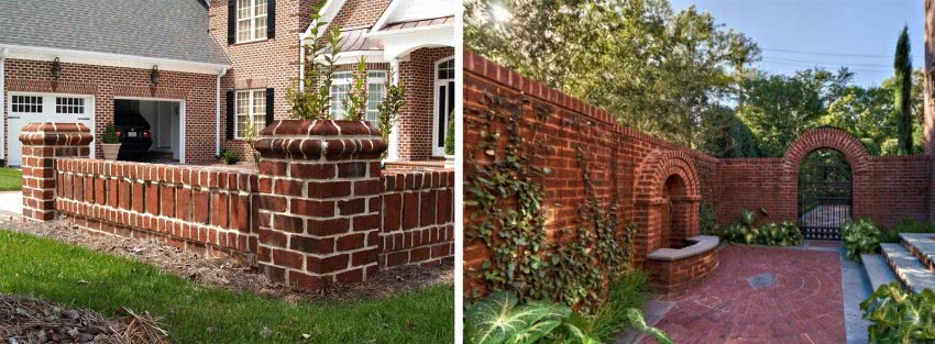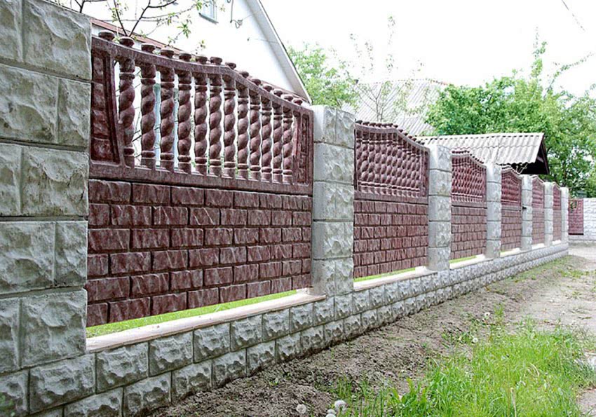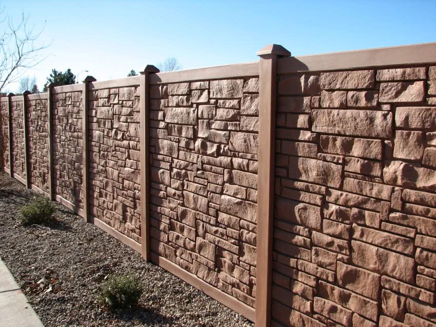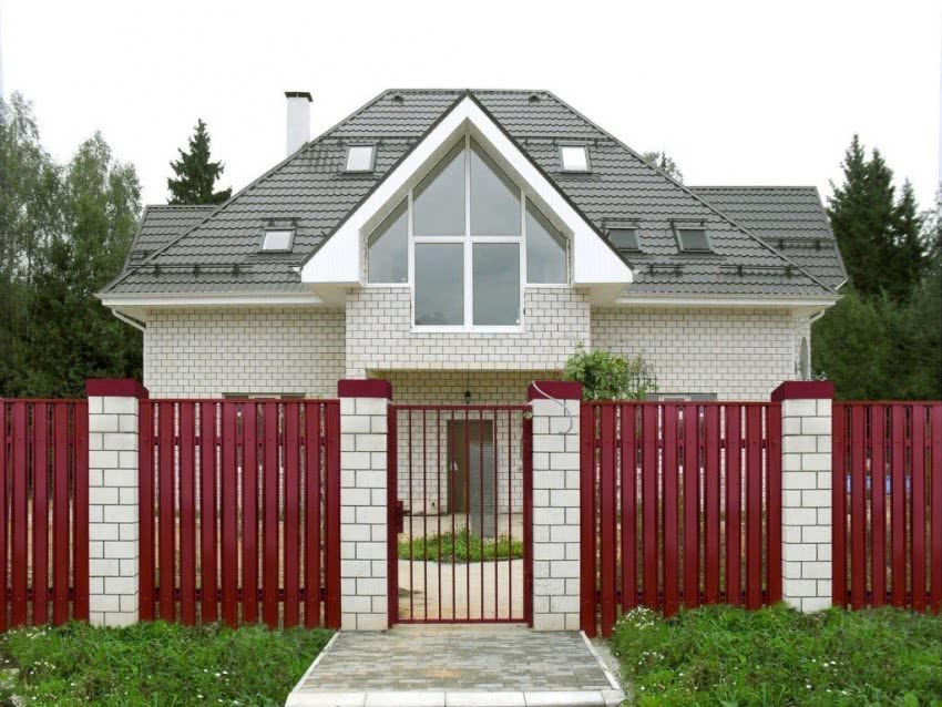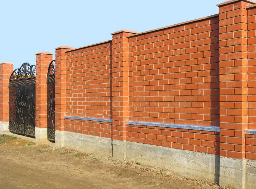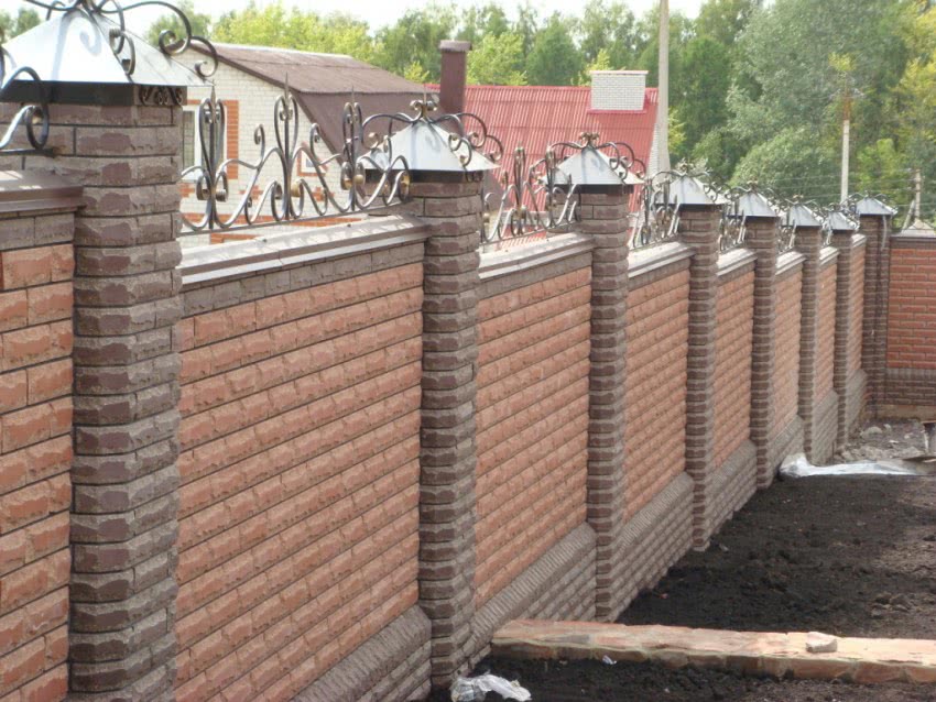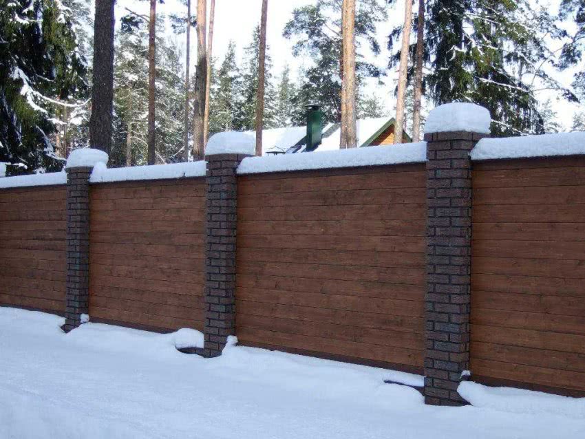 Такой забор визуально уменьшит участок, что, в принципе, не критично, если за его пределами и смотреть не на что. Кроме того, он ухудшит вентиляцию территории. Да и цена такой постройки кусается. К достоинствам можно причислить высокие защитные функции и долговечность.