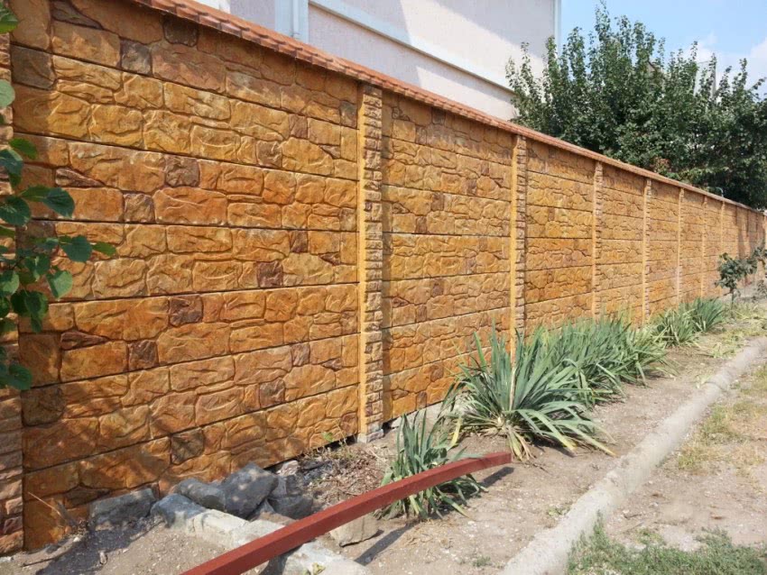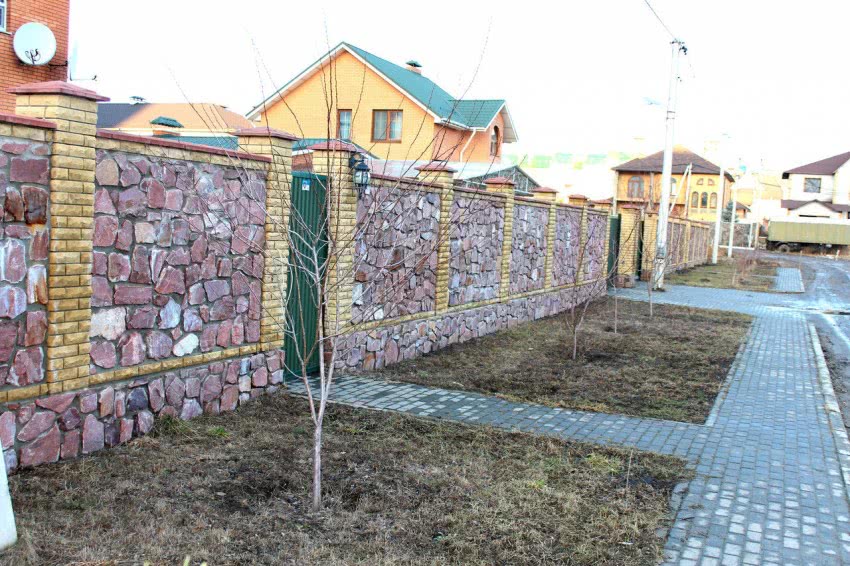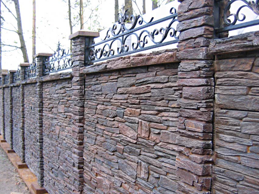 Цельный забор из бутового и тесаного (столбы) камня делают высотой 2—3 м. Бетонный фундамент, поддерживающий конструкцию, имеет ширину 0,5 м и глубину 0,7—1,5 м. Ширина подобных заборов варьируется в пределах 0,4—0,6 м. Стену завершает ряд металлических защитных колышков. Последние выходят из козырька, защищающего забор от атмосферных осадков.
