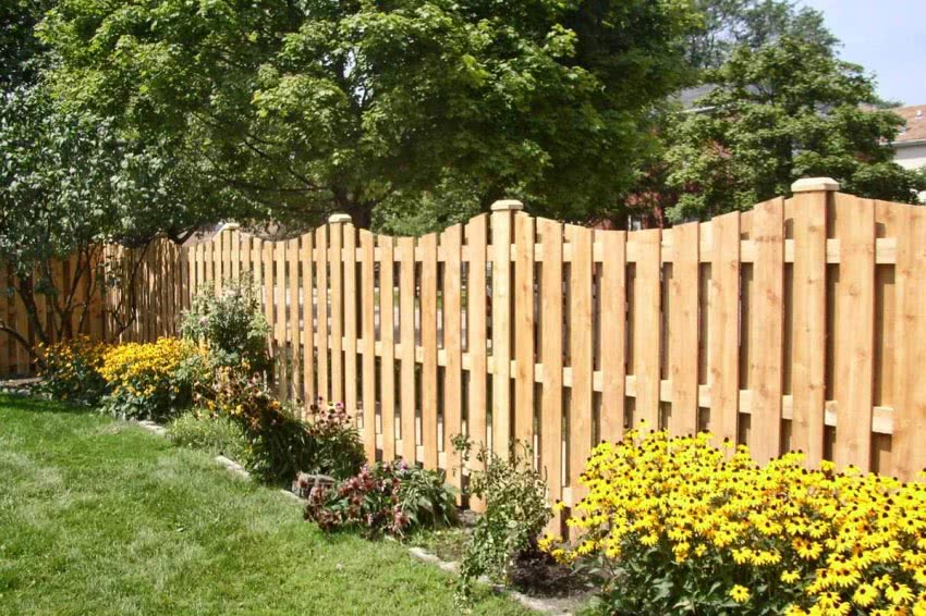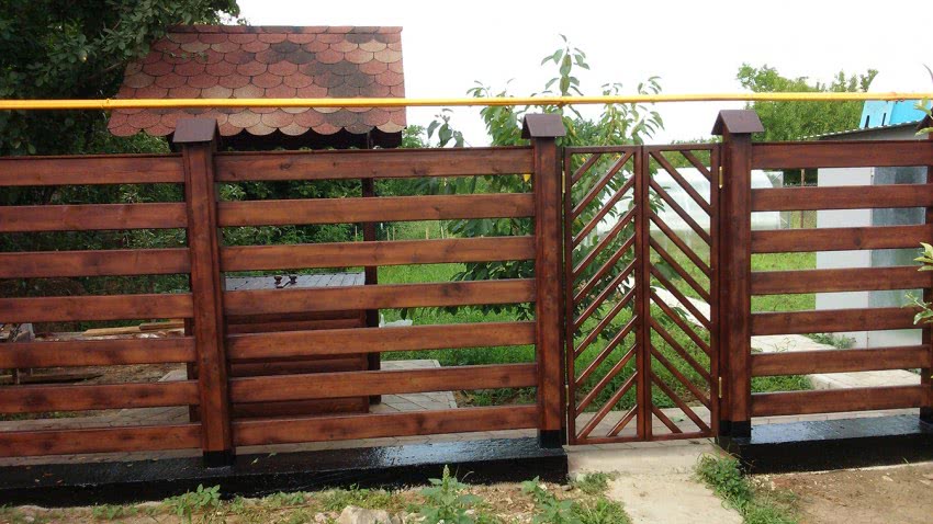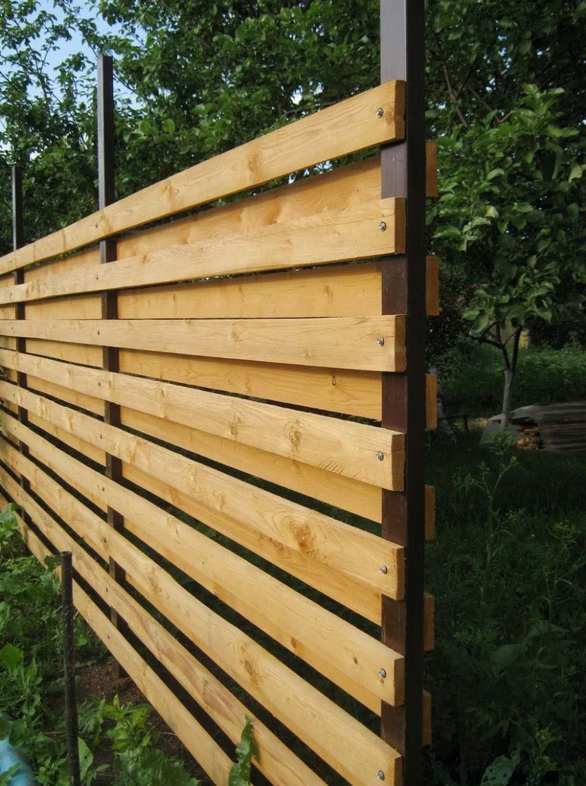 - Создание горизонтальных жалюзи. Для этого в опорах делают насечки, в которые вставляют доски под небольшим углом. Такой метод практически закроет обзор, но существенно сэкономит количество материала. Кроме того, это идеальный вариант для мест сильных ветров, так как забор не будет подвержен ветровым нагрузкам.