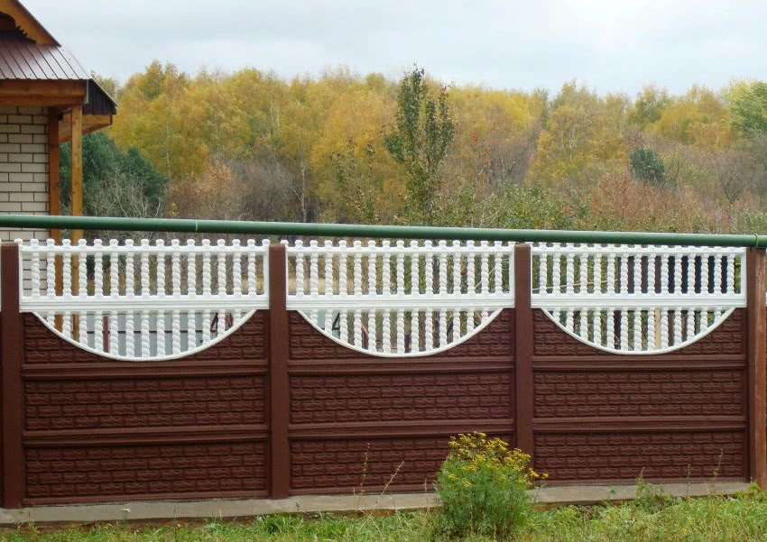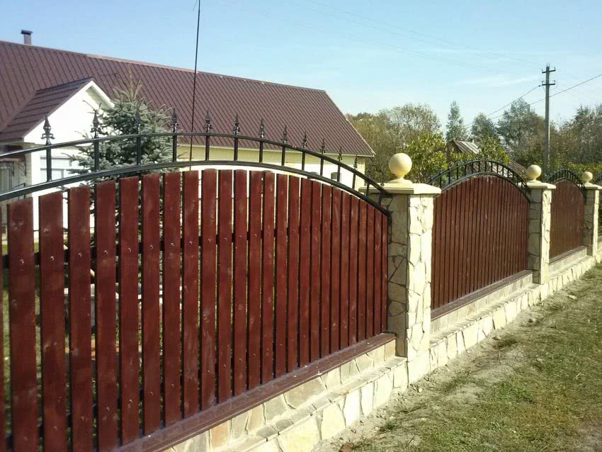 Комбинированные, неплохо просматриваемые конструкции средней высоты позволяют снизить расход материалов на постройку и при этом достаточно четко выделяют границы территории дачного участка.