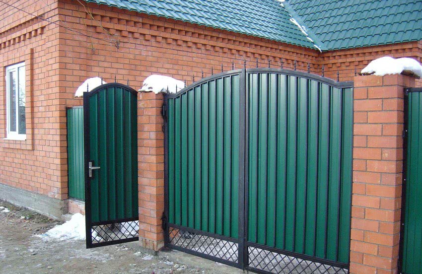 Для заборов из профлиста при изготовлении их своими руками, чаще делают распашные ворота. Для этого необходимо сделать рамку по размеру створок и укрепить её поперечными рёбрами жёсткости. Используют металлические профильные трубы сечением от 20х40 мм. К створке приваривают верхние части петель. Прикладывают ворота к опорному столбу, делают отметку для нижнего элемента петли, приваривают его к стойке.