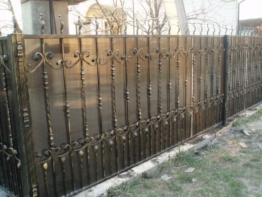 - Из металла, нередко можно встретить глухие заборы на дачном участке , которые обеспечивают максимальную безопасность жильцов и сооружений на территории. К тому же, чтобы изгородь не казалась громоздкой, тяжелой и непроходимой, дополняют ограду красивой кованой калиткой, цельной и с декоративными изгибами;