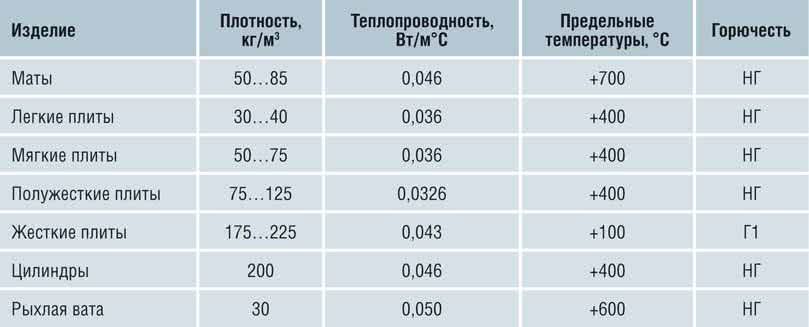 Таблица — технические характеристики минваты