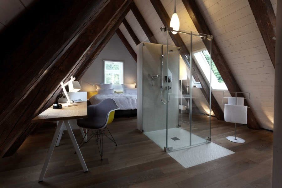 Сложность заключается в том, что поверхности неровные, так как под крышей располагаются балки стропил, и их все придется обходить. Слой гидроизоляции придется выводить под крышу для того, чтобы осуществлялся слив конденсата. При организации работ нужно принять во внимание, что торцовые стены мансарды также нуждаются в покрытии — именно через них уходит большое количество тепла. Каждый дом имеет свою архитектуру, форму крыши и материал кровельного покрытия и стен